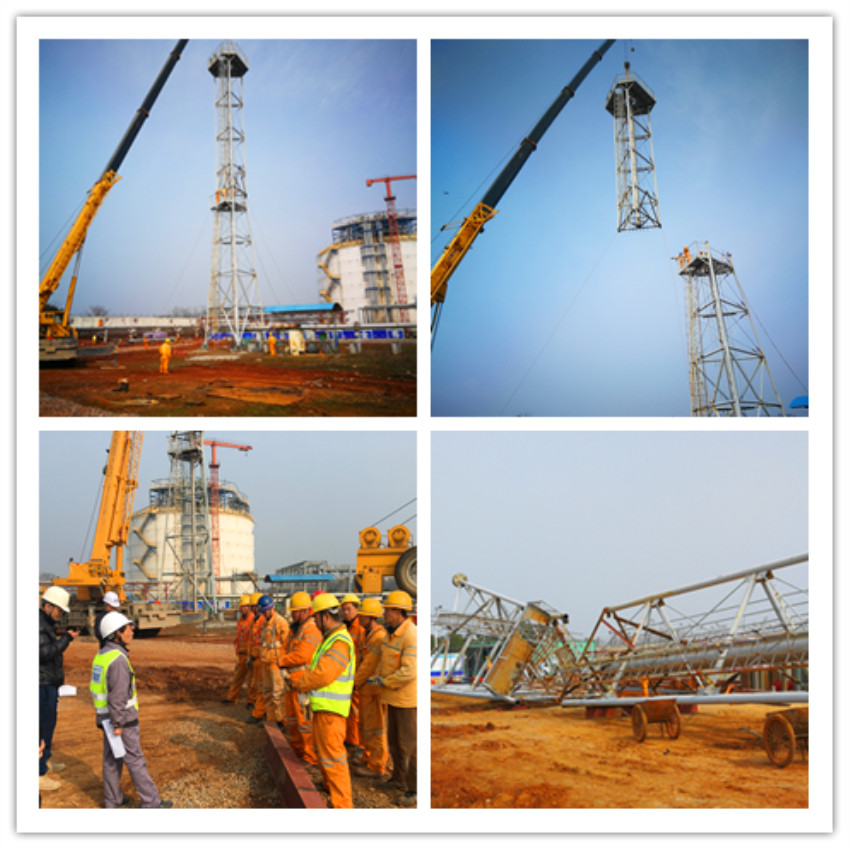 2018年10月底,火炬迁改工程启动,为新罐体腾出位置,将火炬移至新火炬区。火炬高约34米,采用钢管和拉索焊接而成,要采用分段切割后吊装拆除,拆下来后涂刷油漆返修后移至新火炬区重现安装,迁移难度非常大。面对非同一般的施工难度,项目部全体员工在总包方管理人员、高压项目部管理人员、工程部安全管理人员的现场指挥下,不等不靠,集思广益,充分发挥专业技术实力,攻坚克难,克服天气恶劣、施工条件差等众多不利因素,把三个保证——“保证工程质量、保证安全生产,保证如期完成”作为第一任务,用他们锐意创新的勇气、敢为人先的锐气、蓬勃向上的朝气,坚决打好此次攻坚战。