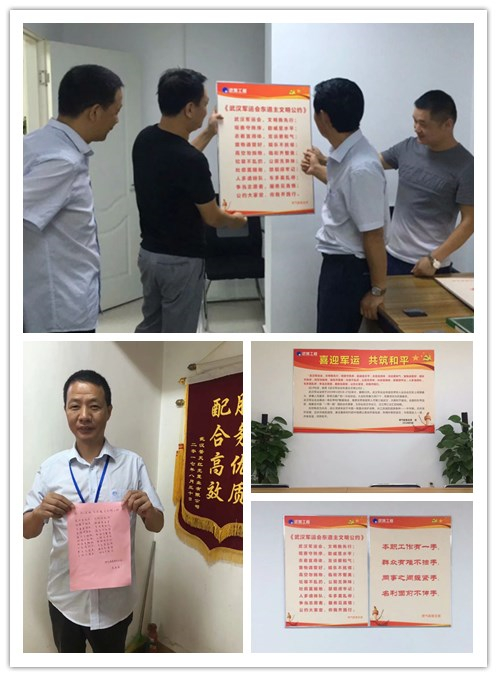 为迎接2019年军运会的到来,武汉市民从现在开始都积极行动了起来,从我做起,从身边的一点一滴做起,迎接军运会的到来。燃气配套服务分公司也积极做好了迎军运的准备,分公司支部将军运会的相关知识和信息以及武汉军运会东道主文明公约做成了宣传展板,分别悬挂在分公司办公室及所属各项目组办公地点醒目处,加大宣传,让每个员工了解军运会知识,知晓军运会的意义,并严格遵守文明公约规定,做文明员工、文明市民。分公司支部还积极发动员工向身边人进行宣传,认真抄写文明公约,从我做起,从现在做起,迎接军运会。后期,支部还将组织一些迎军运的具体公益活动,用实际行动来为武汉军运会的举行尽自己一份力。
