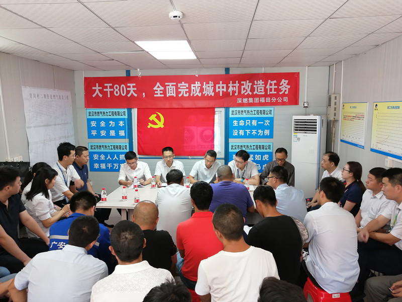 2019年10月18日下午,深圳市燃气公司在我公司深圳皇岗村项目部组织召开了“大干80天,全面完成城中村改造任务”专题动员会。会议前,深圳项目部与深燃福田分公司一起对会场进行了布置,庄重的党旗高高悬挂在会议室的正前方,带有“誉城千里”品牌的宣传标语布置在会场两侧。参加本次会议的有深圳福田区住建局陈科长、深圳燃气公司刘为民经理及领导班子、监理公司、设计院及福田区其他施工单位项目负责人等60余人。会上陈科长就工期安排及安全文明施工做了重要指示,刘为民经理宣读了深圳市燃气公司的文件。会议要求项目参建各单位的党员同志、青年骨干成立项目“突击队”,充分发挥党组织“战斗堡垒”作用,要求党员同志起到模范带头作用,冲锋在前,勇于担当,要求我公司以80天工期为目标,统筹安排,合理计划,务必在确保安全的前提下打赢这场攻坚战!