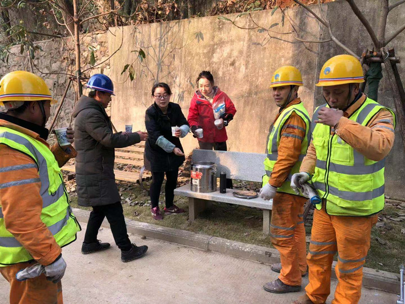 马鞍山森林公园职工宿舍楼项目为近期高新分公司的重点工程之一,该工程是市政府重点民生发展项目,项目施工难度大且时间紧迫。在天气条件恶劣情况下,该项目仍在正常开展中,施工期间得到了各方领导及马鞍山公园管理处的大力支持(含华科大借道工作,已完成)。我分公司现场人员克服雨雪天气、加班加点的工作精神让业主方大为感动,公园管理处的职工们于12月11日为现场施工人员送来姜汤予以慰问,让在我们在这寒冬时节感受到阵阵暖意。