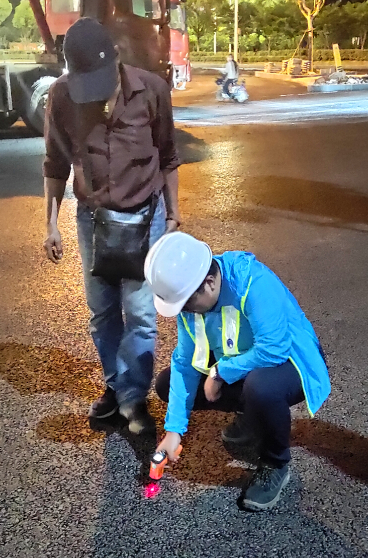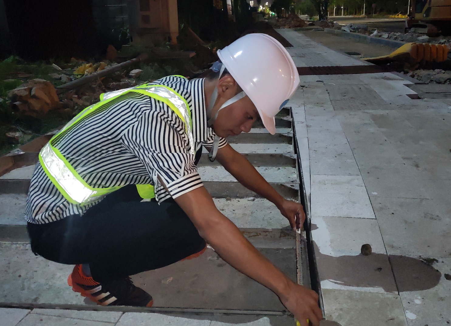 初次承担现场全盘管理,杨玥同志思路清晰、上手快,能迅速熟悉项目图纸及现场施工情况。接手该项目时,恰逢项目主体施工即将完成,而建设单位又提出新的要求,在工期不变的情况下,将花山大道与九峰一路路口进行扩宽,而且要将原已做好的步砖站石更换为花岗岩石。面对突发状况,杨玥同志不急不燥,组织项目部将任务进行分解,确立各项小节点,以小节点来落实大目标,带领项目部克服了石材供应周期长、管线迁改复杂及花岗岩站石安装调配等一系列问题。同时,因为项目的特殊性,备受各级领导关注,无形中增加了项目的管理难度,杨玥同志敢于吃苦碰硬,做到沟通不“延时”,很多时候即使到了凌晨一两点,还在群里与大家在线沟通项目进展中遇到的相关问题,拿出解决办法,确定实施方案,为第二天项目顺利施工作好充分安排。正是因为有了他和团队的付出,至5月22日,施工现场具备了进行底层两层沥青混凝土施工条件,紧接着,他们不顾白天的疲倦,经过连续两天两夜的通宵奋战,如期完成底层沥青摊铺。