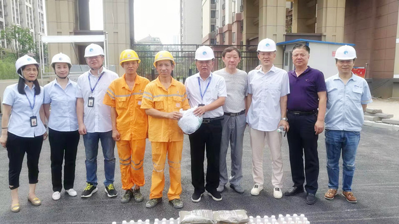 8月8日虽已立秋,但炎热的三伏天气仍未过去,武汉依旧处于酷暑阶段。2019年8月15日上午,公司董事长沈斌带队,公司安全工程管理部、人力资源部及综合部相关职能部门人员共同参与,在燃气配套服务分公司副经理王劲的陪同下,一起到分公司所属旭辉半岛、景悦苑两个工程项目的工地现场进行了高温慰问和安全检查。沈董事长对现场表具、材料的堆放整齐,对安全设施的设置与摆放、安全标语的张贴齐全等进行了称赞和表扬,对现场人员战胜酷暑坚守一线表示了亲切的问候,送去了防暑降温物品和清凉饮料,同时嘱咐一线人员一定要注意生产安全,注意防暑降温,在完成生产任务的同时一定要保证人身安全。