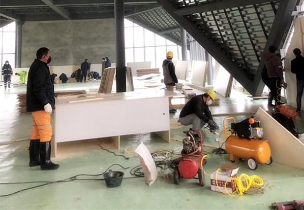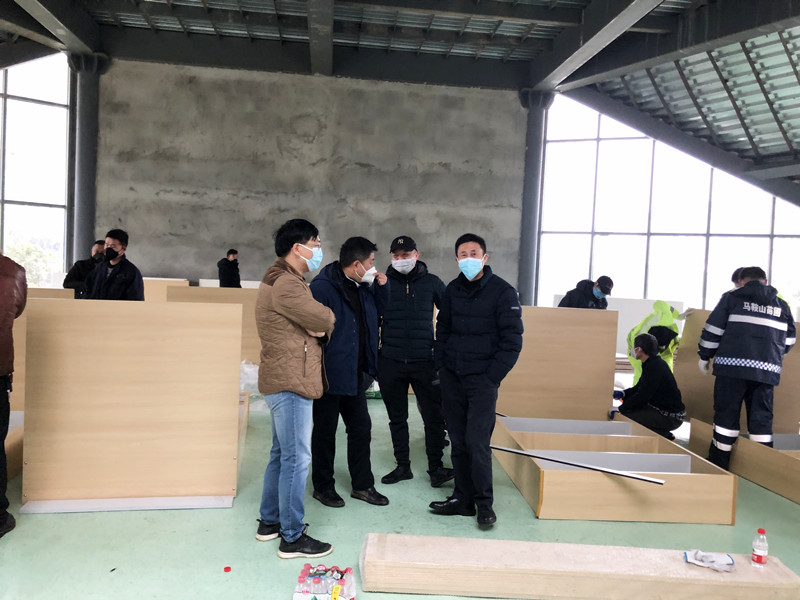 截止发稿,白马驿站方舱医院已完成了场地平整铺胶,部分内外隔墙施工、床位安装、水电及照明安装、木板床拼装。计划2月7日凌晨完成200张板床的拼装及隔板的安装,2月7日中午全面完工,下午进行场地清理、交工验收。为保证工程质量,武汉安宇监理有限公司也加入到方舱医院的建设监督管理中,最大程度保障建设施工安全质量。