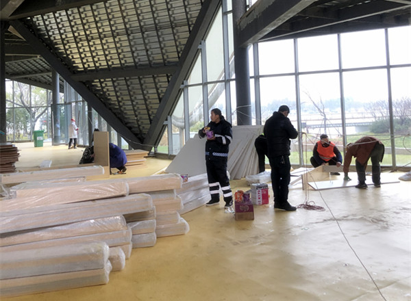 白马驿站,南临东,为钢构+幕墙结构的半开放式毛坯建筑,建筑面积约2000平方米,计划改造成容纳200人(计划210个床位)左右的方舱医院,对武汉市新型冠状病毒肺炎患者进行隔离收治。现场结合实际情况进行了施工图设计,迅速拟定了施工计划。誉城千里董事长沈斌、总经理谢辉迅速调配90余人,兵分三组,一组为物资组,负责工程设备材料物资的调配及医院所需基本生活物资采购;二组为搬卸安装组,负责床具的转运及搬卸组装;三组为工程施工组,负责医院场地面平整铺胶、内外隔墙(封堵)、设置方舱分隔区域隔断、水电路照明设施安装及配置床、柜等。时间紧、任务重、人手不足、物质短缺、现场条件差等等困难,丝毫不能冷却大家那颗火热的心,援建战“疫”即刻打响!