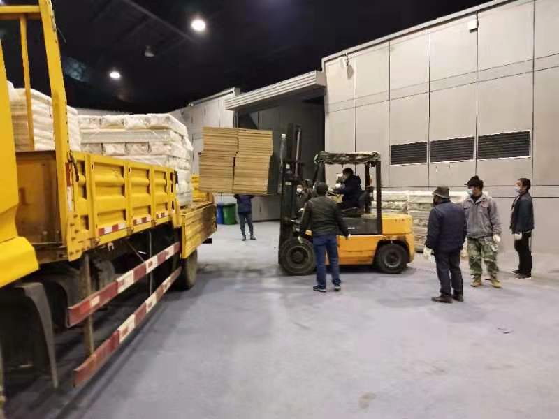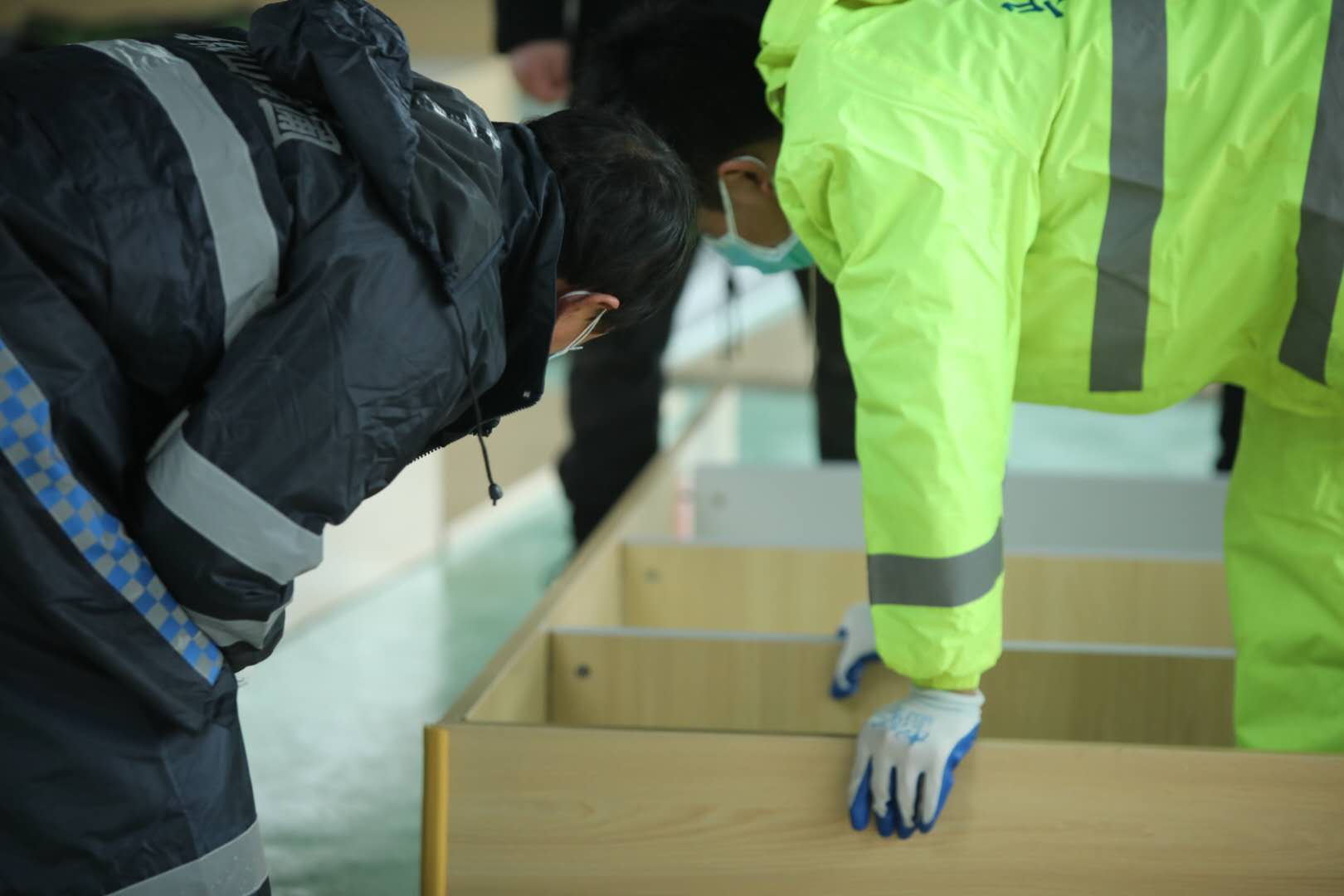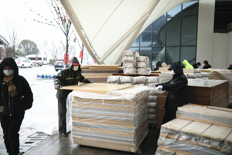 干部职工冒雨搬卸物资、火速改造建设方舱医院