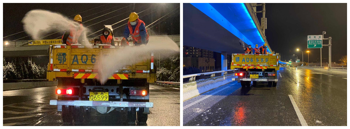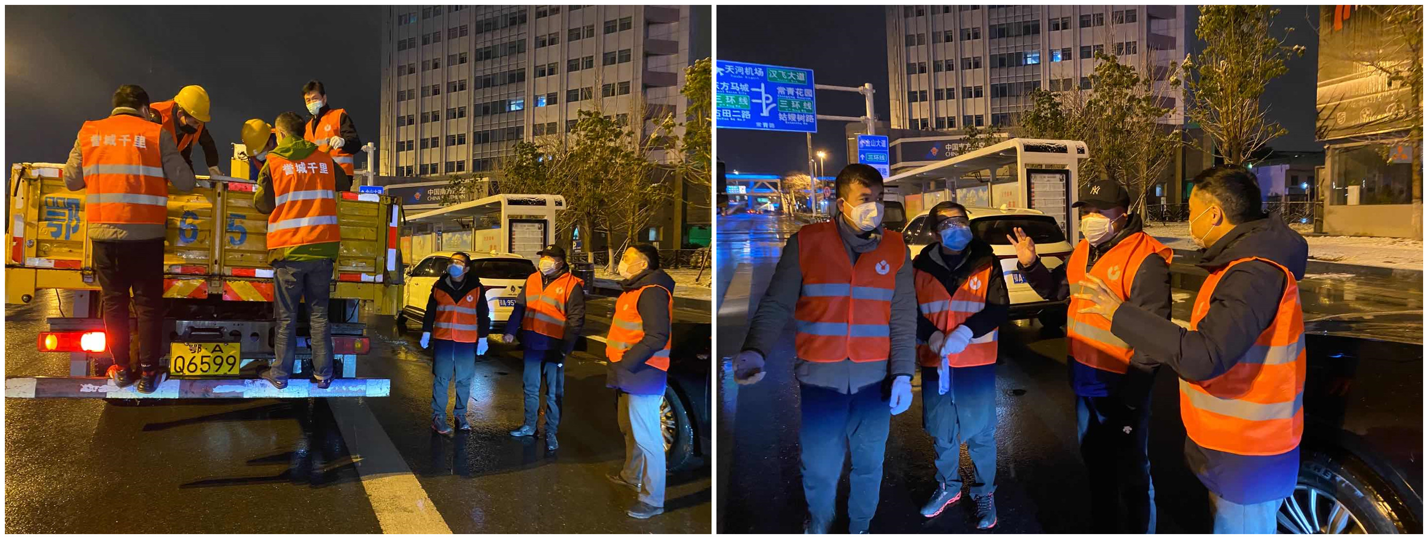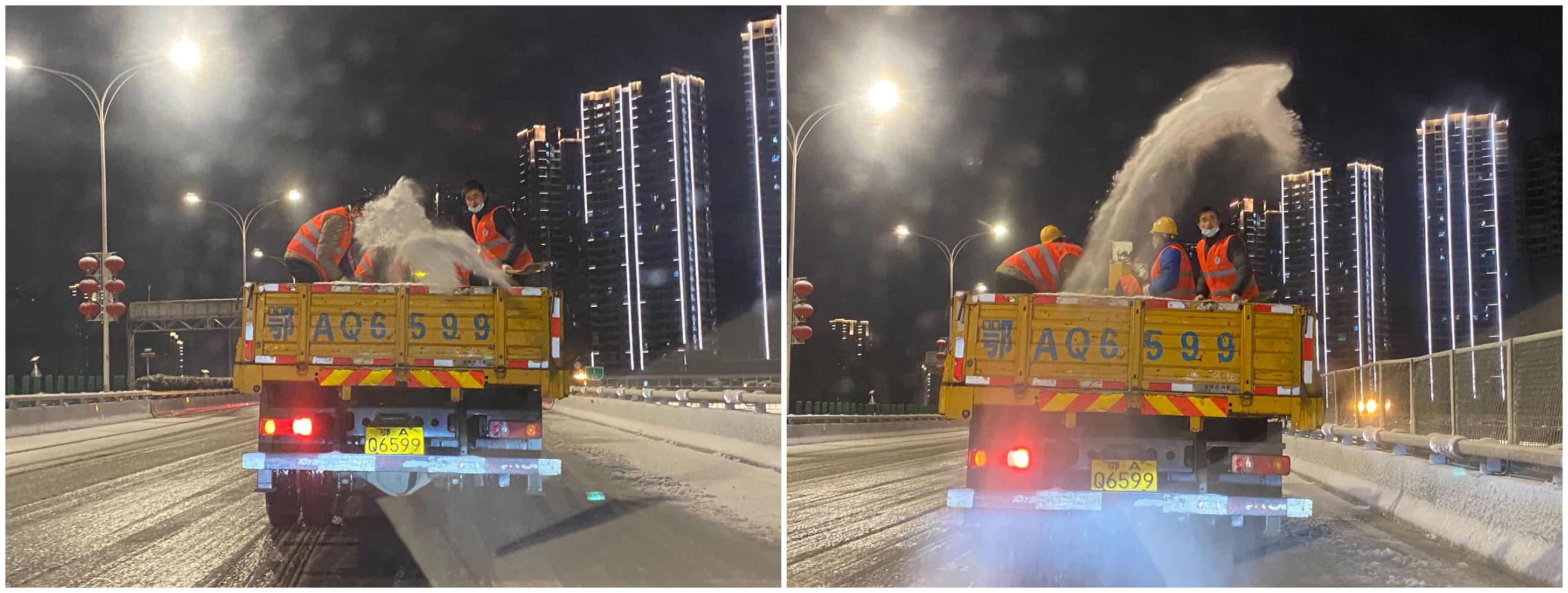 在抗疫工作极度紧张的情况下,我公司“方舱建设”、“融雪除冰”两线作战、同时出击,任务艰巨!公司谢总、何总按会议要求,带领抢险中心、设备经营部、工程部采取人机结合的模式,对(三环线北常青立交-盘龙立交)全长5.5公里路段,进行路面撒盐及除冰工作。誉城集团公司王总、万部长、余杰与我公司韩捷、陈运清、范红祥、盛明辉等同志一起,连续奋战,保障了此条道路的畅通和市民群众出行安全。