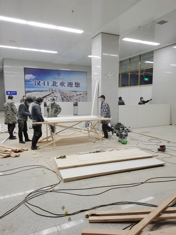2月16日,武昌项目部接到武汉科技会展中心方舱医院建设支援需求,一支由经理带队的驰援队伍立即向科技会展中心方舱医院进发,项目部7人共承揽522个床位中105个床位铺装。建设过程中,通过采取划分档口、小组承包、领先组帮助落后组的方式,项目部在第一时间完成所有铺装任务。次日,这支队伍再次出发,马不解鞍投身汉口北方舱医院建设。