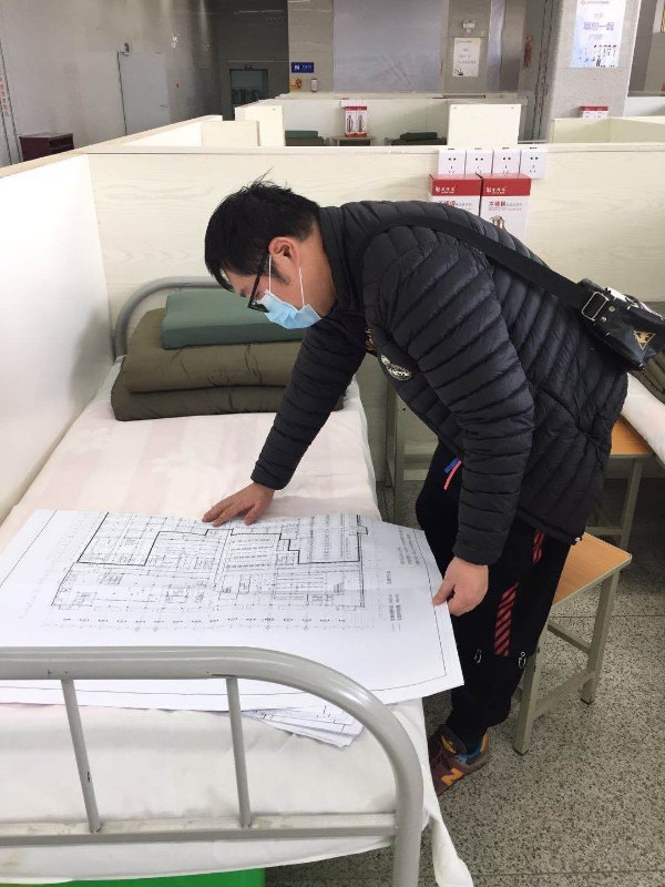 2月17日中午,武昌项目部在汉口北方舱医院的建设任务分配时,主动承揽400张床位区域。而就在前一天深夜,他们刚刚完成上一个方舱医院的建设。