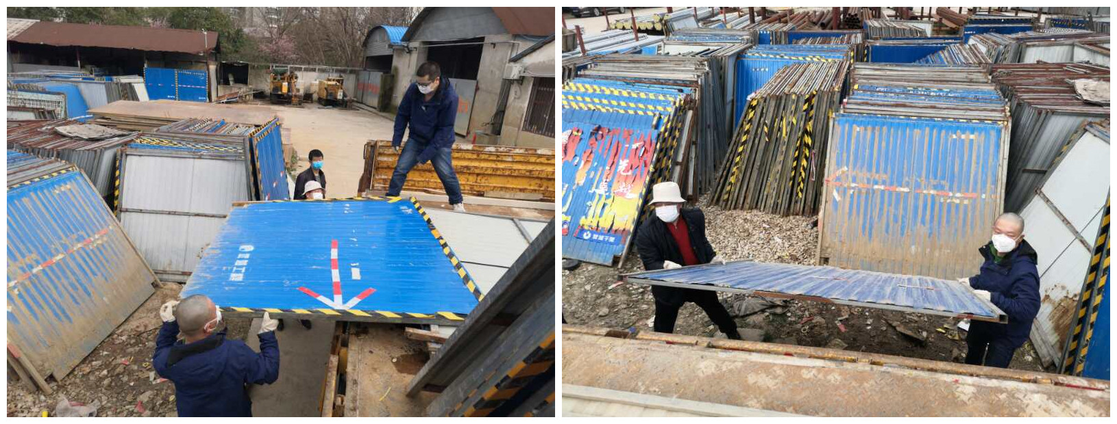 疫情控制时不待我,群众需求刻不容缓!东西湖项目部领导果断做出决定,一边等待新通行证审批,一边安排项目部人员持现有通行证,冒险尝试赶赴设备经营部进行围挡装车。为了节约每一分每一秒,项目部全经理迅速赶赴现场,与下沉干部江汉洪书记及社区工作人员对接,确定现场工作量及围挡布置方案。东西湖项目部七名干部职工手托、肩扛,用最快的速度完成了80块围挡的装车,奔赴到现场。