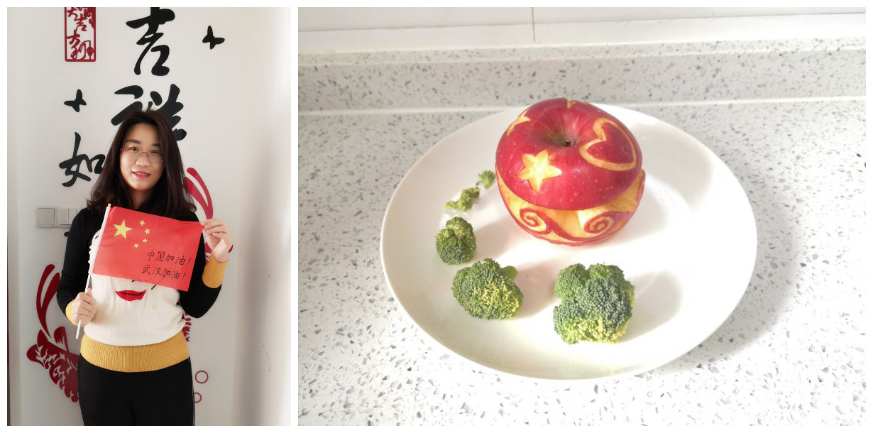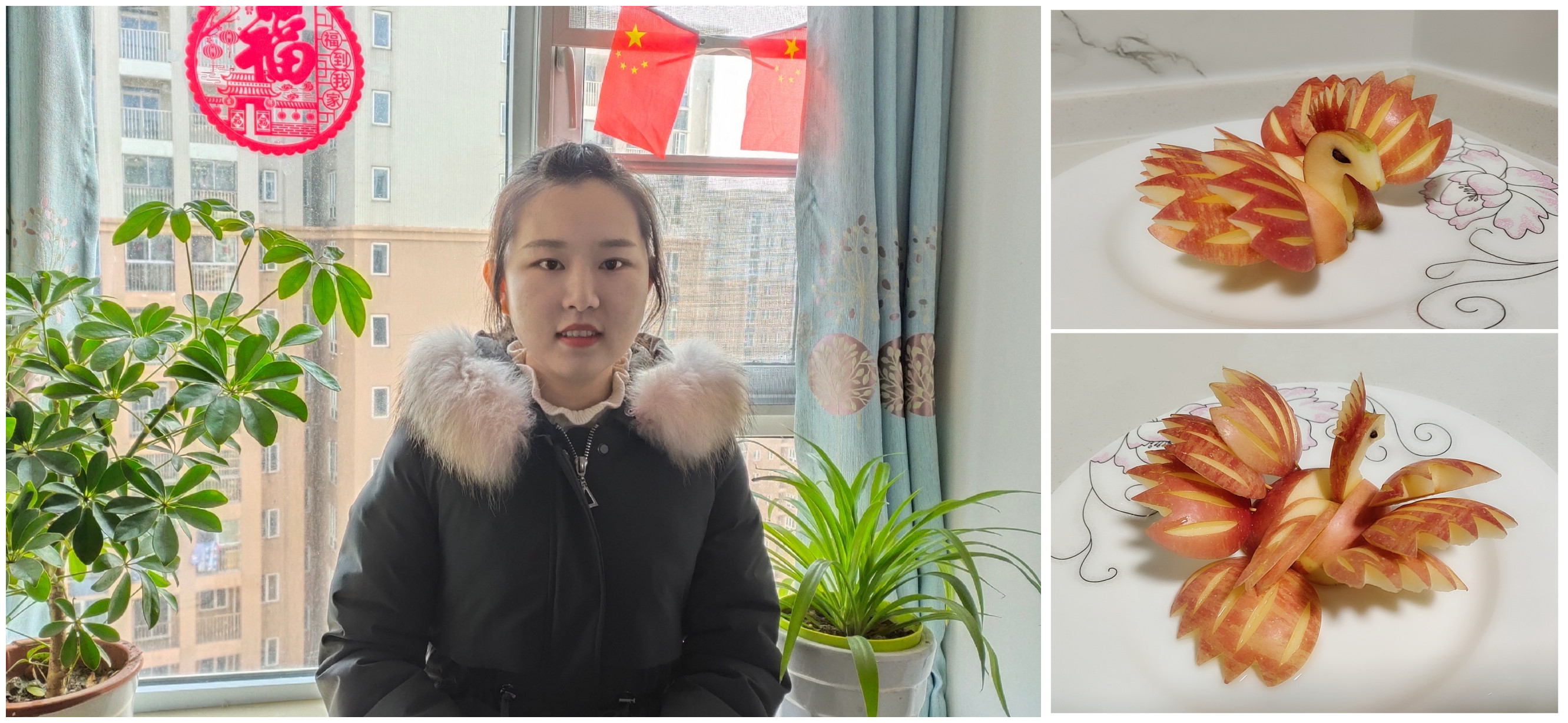 梁丹娜:凤凰祈安。以苹果为原料雕刻的凤凰鸟,寓意着平安、健康与祥和。在此,愿庚子年间举国上下同安康,万众一心抗疫情!也愿誉城千里继续秉承"誉满江城,名扬千里"的建设初衷,更能与凤齐飞、造福万家!