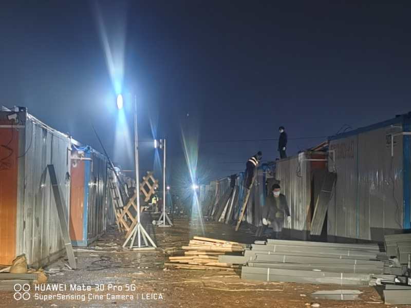 2020年3月8日22:30,临时照明材料刚刚到场,袁书文和电气专业分包方现场负责人赵林就充分利用公司仓库现有材料设计的DN15镀锌钢管制作的架空灯杆电源,从现场组装的临时配电箱穿过马路到指挥部办公点取电。从第一盏灯的点亮,到陆续点亮10多盏吊装配备的临时灯具,再到制作的4盏移动照明灯,为大雨淋漓下的吊装现场提供了临时照明,为施工作业安全有序的进行保驾护航。