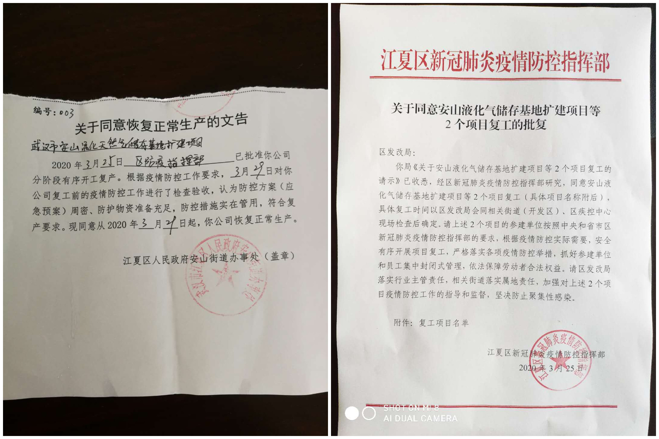 随着武汉市的疫情控制持续向好,武汉市安山扩建项目的复工复产也提上了日程,2月12号、15号与业主单位高压管网公司和EPC总包单位武燃设计院召开了视频会议,3月6号、11号在高压管网公司楼顶召开了复工准备会议。为满足业主要求,确保项目能在2020年底投产使用,高压外环直属项目部积极响应,尽早谋划。3月9日开始安排专人统计进场的管理人员、施工人员健康状况,督促进出人员进行健康码打卡,一人一档,保证进场施工人员的健康。3月15日编制完成了第一版安山扩建项目复工复产防疫方案,交由上级单位报送江夏区发改局、防疫指挥部审批,并将现场防疫所需的物资计划报送给安全工程管理部,提前准备。项目部管理人员在家中编制了储气库内施工所需的原管廊上钢结构加层、原压缩机罩棚拆除、压缩机基础等专项方案报EPC、监理单位审批;安排专人跟踪施工所需的钢结构、钢管、管件、混凝土等材料厂家的复工复产情况,跟踪生产进度。通过各方共同努力,3月26日上午收到了江夏区防疫指挥部同意安山扩建项目复工申请的批复,复工时间要根据江夏区发改局会同安山街道及江夏区疾控中心检查复工准备情况后再确定。