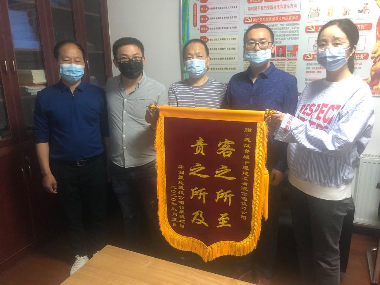2020年5月9日,华润置地武汉公司翡翠城项目部刘经理一行满怀感激之情,赴燃气汉口公司驻地送上锦旗,对燃气汉口公司施工的华润翡翠城燃气项目在安全、质量、文明服务给与高度赞扬并表示感激之情。