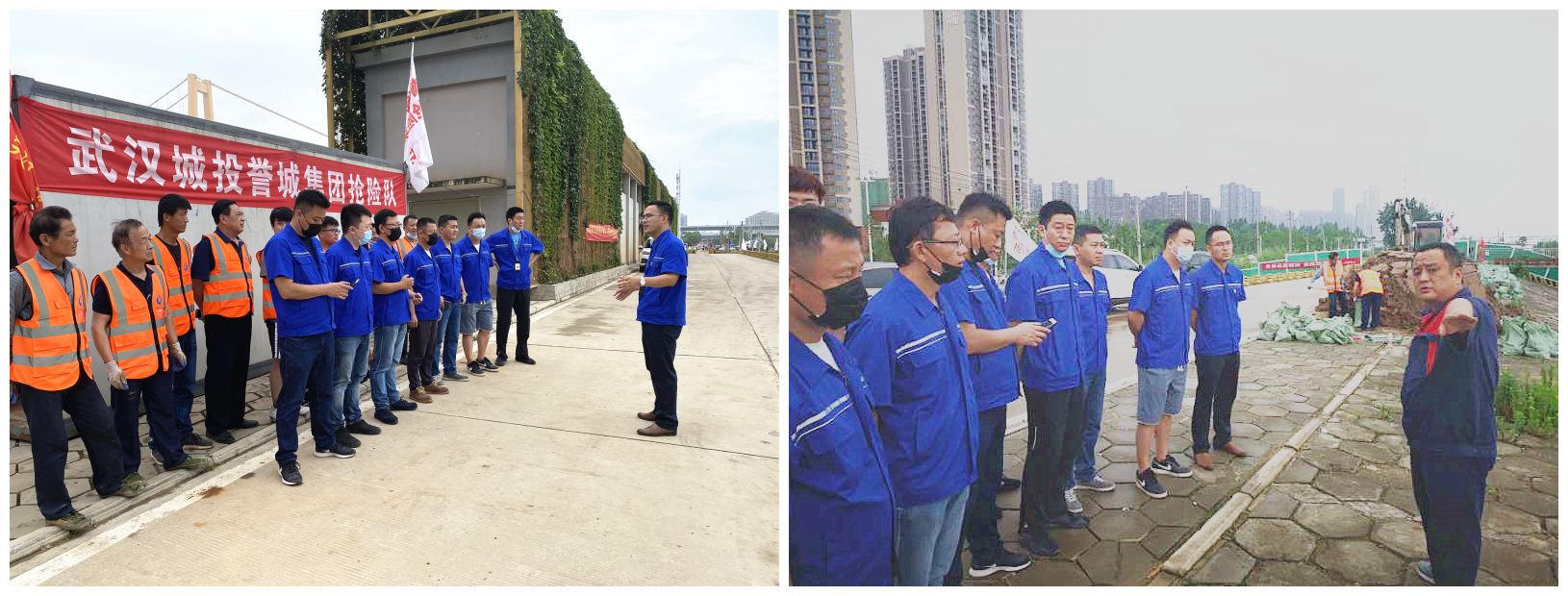 在此万分紧急的时刻,13日上午8时,燃气汉阳公司的抗洪勇士们已在公司楼下集合,在官冠经理、张明洪书记、张凯勇副经理的带领下,共计8人出发前往江南泵站,参与泵站及武金堤区域段闸口巡防任务。