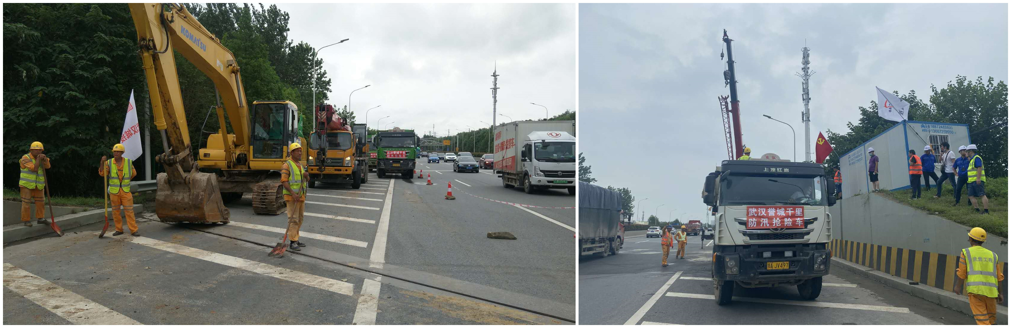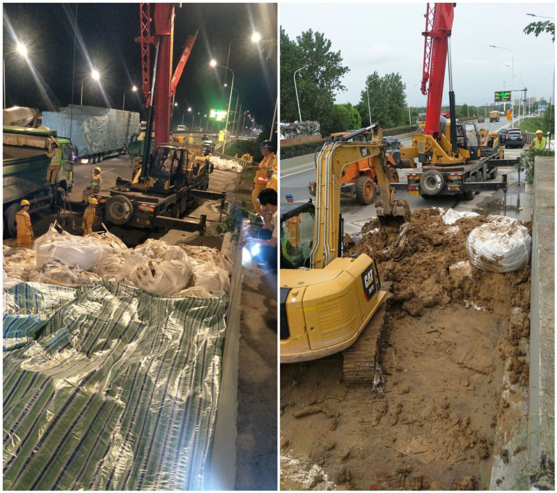 马不停蹄,分头行动。下午3时,三环线谌家矶闸口现场机器轰鸣,参与防汛的干部职工紧张有序的展开防汛抗洪工作,有的指挥装载车辆运输吨袋,有的指挥吊车转移吨袋,有的进行交通疏导,有的清理调配抗洪物资,大家的工作服早已被汗水湿透,脸上布满倦容,却没有一个人叫苦叫累。已填充土的吨袋运到现场后,吊车将吨袋整齐堆放在三环线辅道边上以免影响交通,在三环线边上设置了警示旗、夜间警示灯。公司沈董亲临现场统筹安排,杜书记驻守现场要求全体干部职工在紧抓防汛工作时做好个人安全防护,发挥党员模范作用和“铁军”精神。谢总、何总对人员、车辆机械、取土点统筹调度,协调指导,具体部署。常总在现场协调督导机建公司土方转运,部署现场交通安全指示牌的设置。