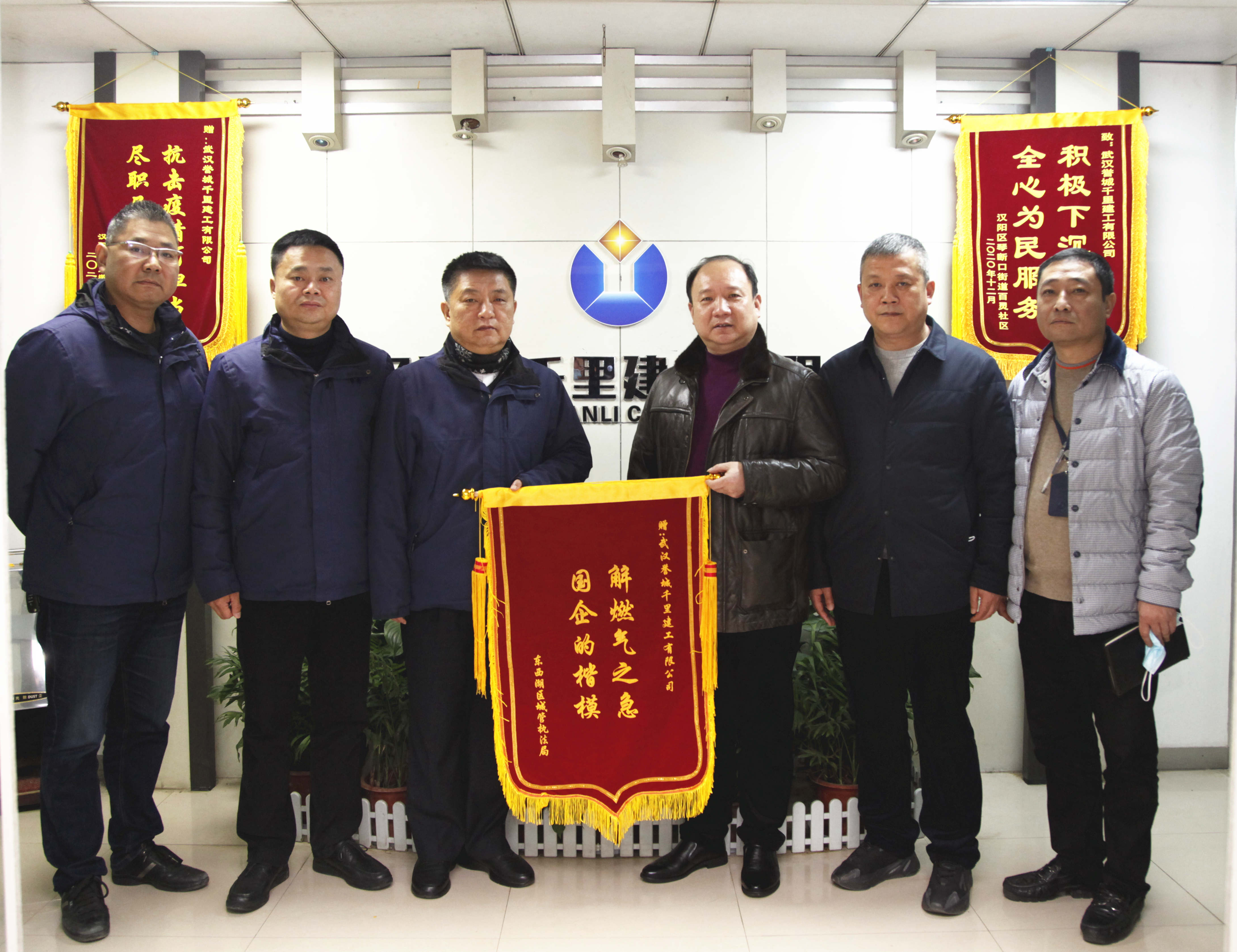 临近新春佳节,燃气汉口公司积极调配施工人员,压实工期,落实安全,于年前顺利完成了辛安渡中压、油沙路中压、金北一路中压施工项目,为东西湖区居民创造了良好的用气条件。2月7日,东西湖区城管执法局尹副局长、区燃管办李主任,天然气公司东西湖工程办杜经理一行5人,给公司送来一面“解燃气之急,国企的楷模”的锦旗,对燃气汉口公司为后续通气施工打下的坚实基础表示由衷的感谢!